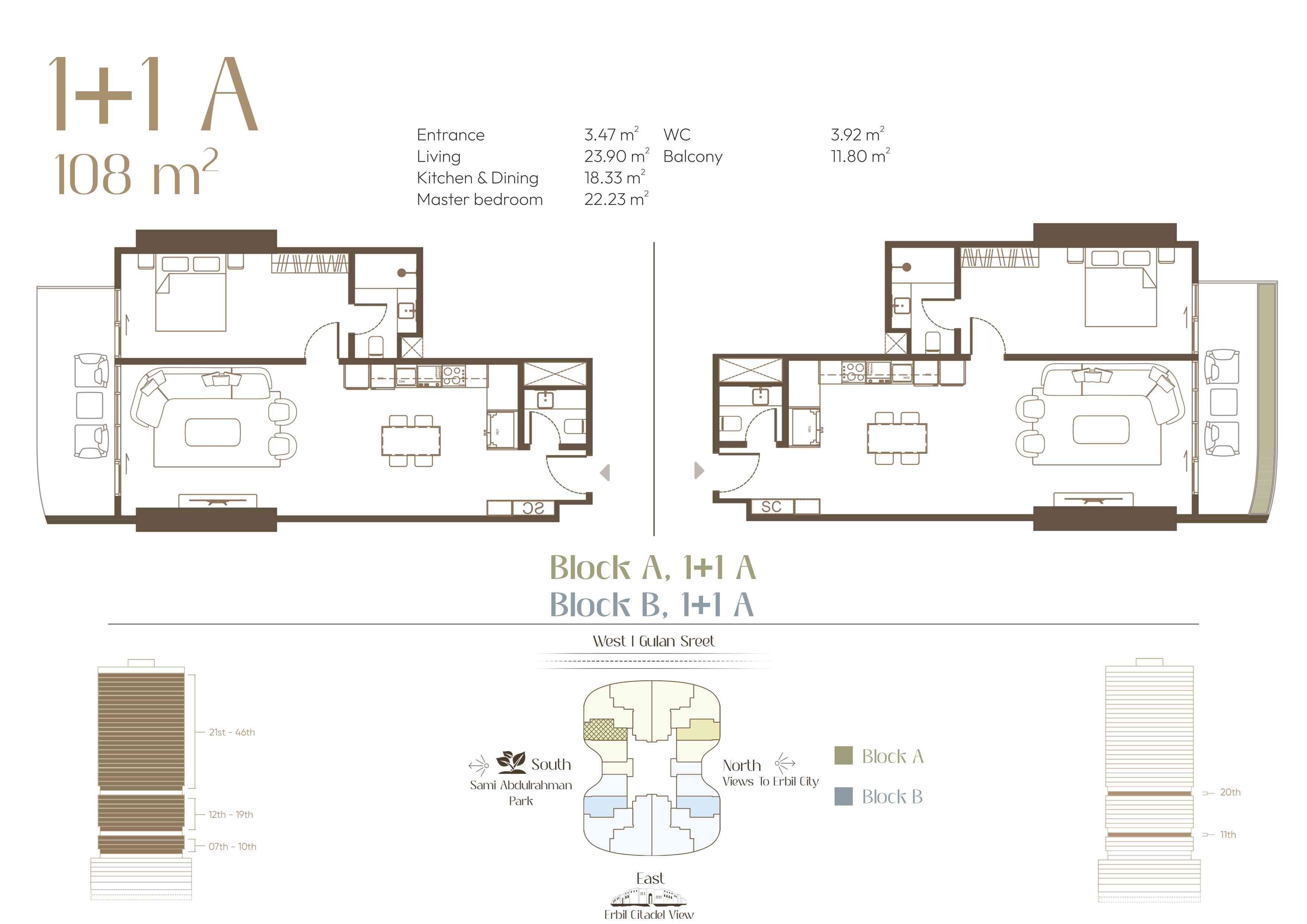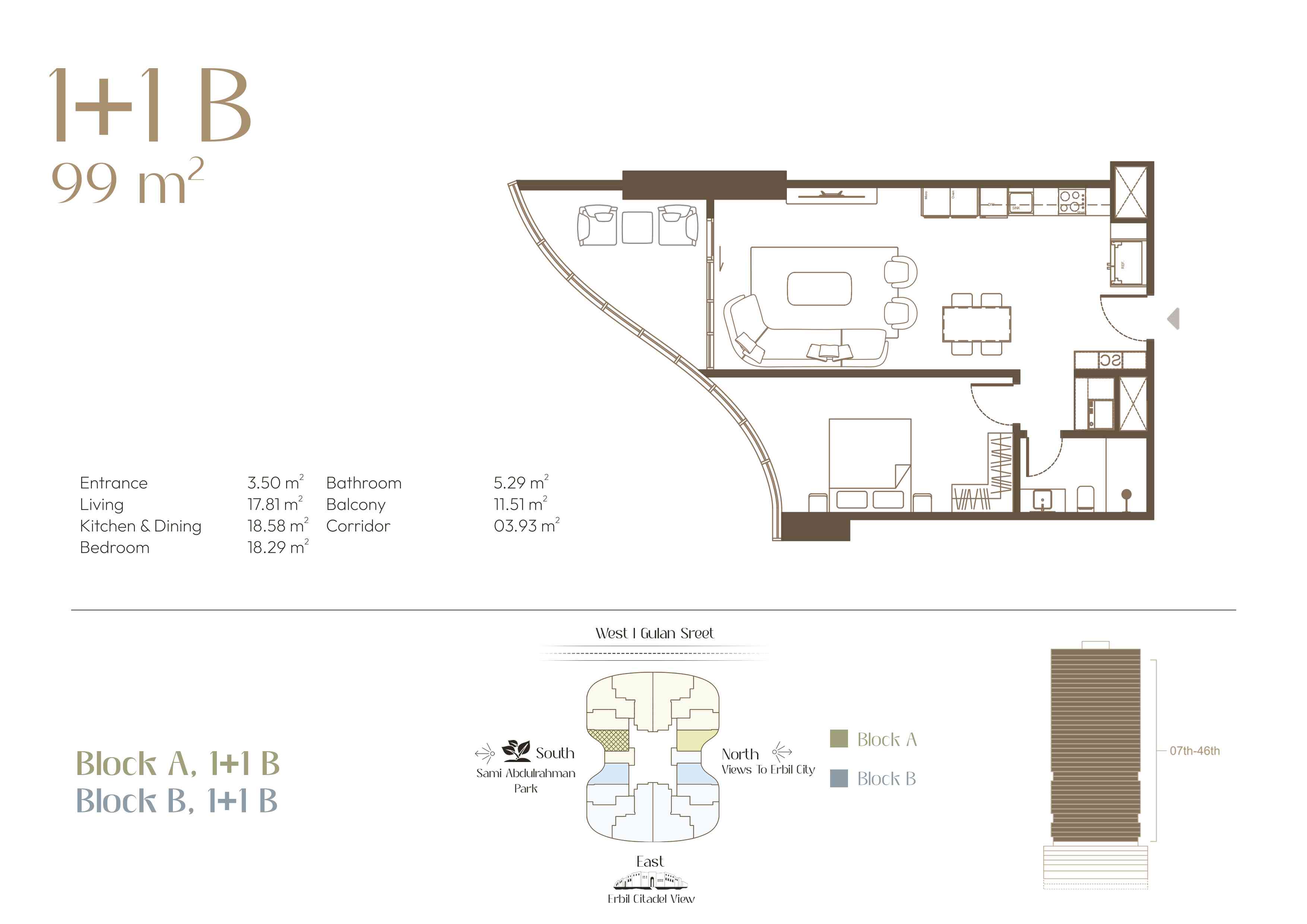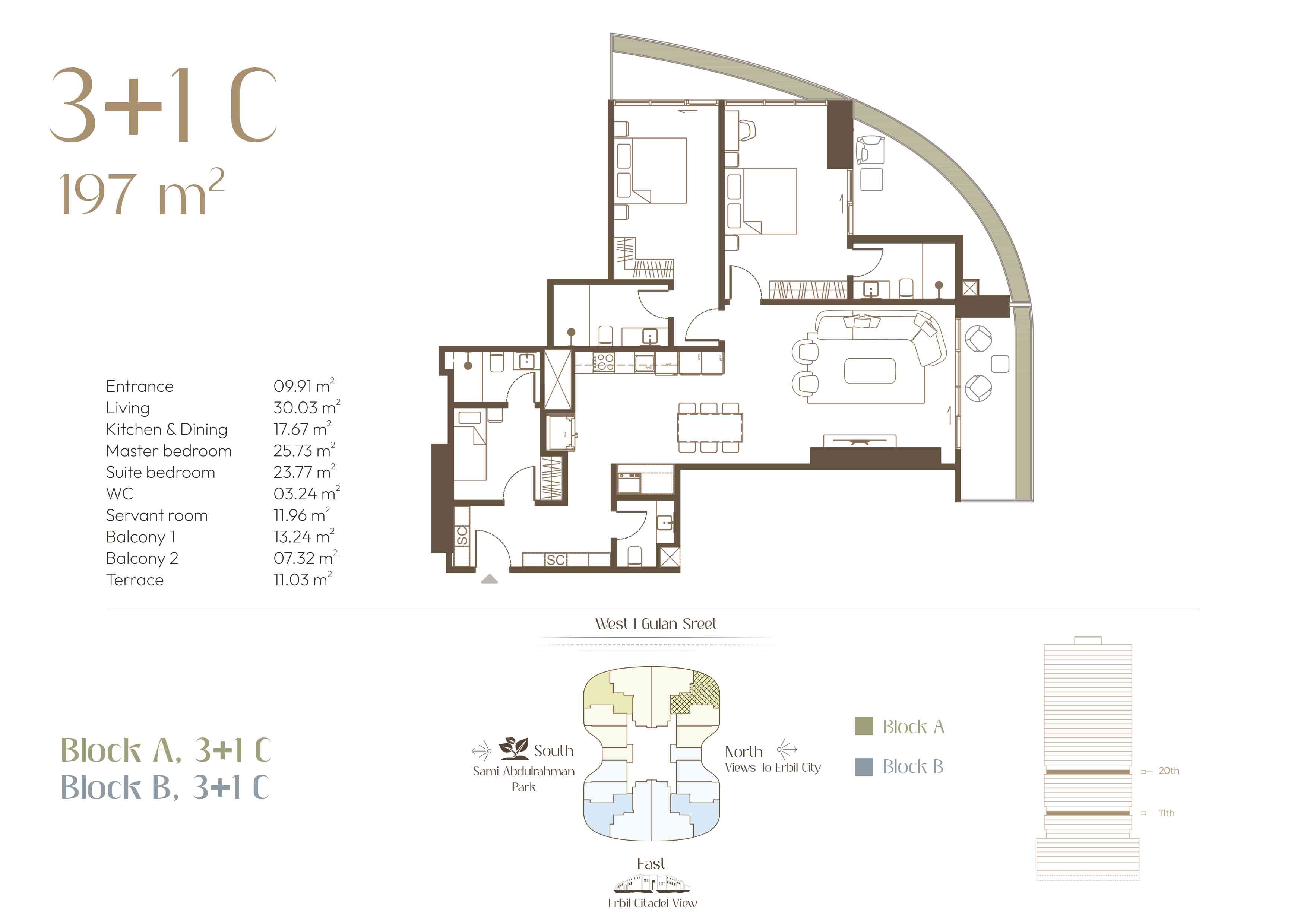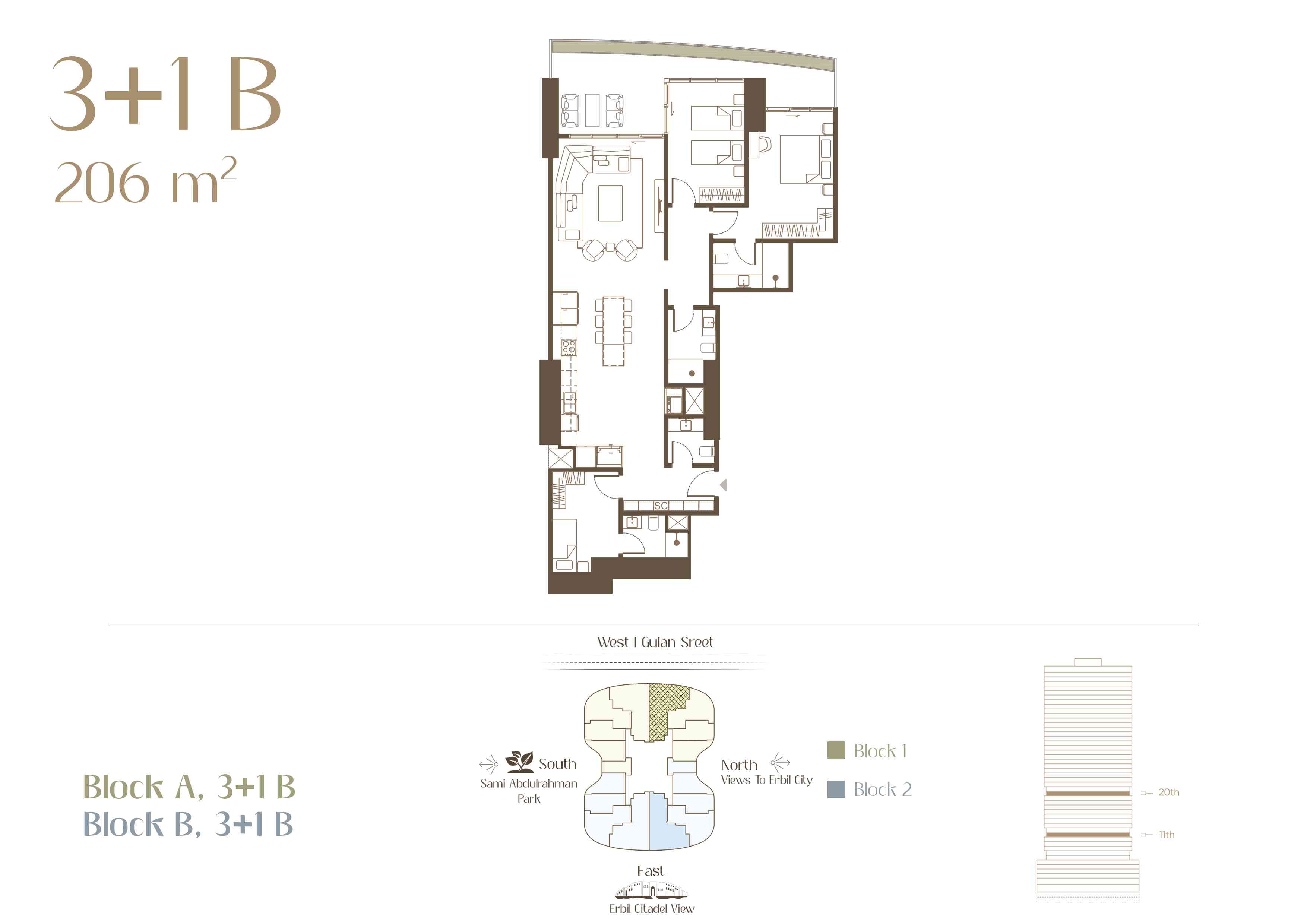 Located in the heart of Erbil City, along with Gulan street (40 metre St.), this residential complex represents modern luxury living. The design of each apartment is a balance of practicality and style, charming outdoor lighting, and unique views that redefine the idea of urban life. As the sun sets over the city and the decorative lights come on, enjoy the scenery from the comfort of your exclusive balcony.