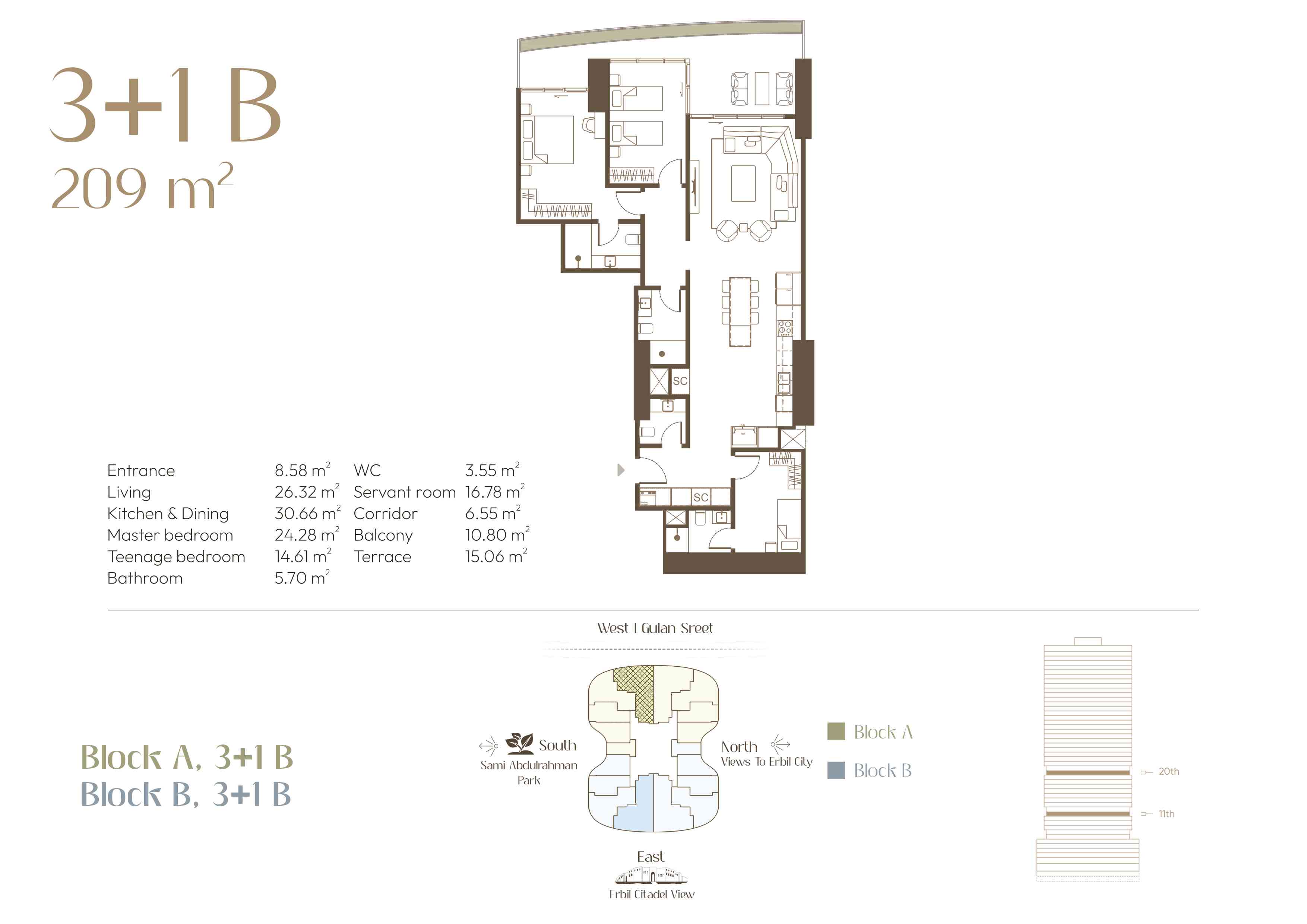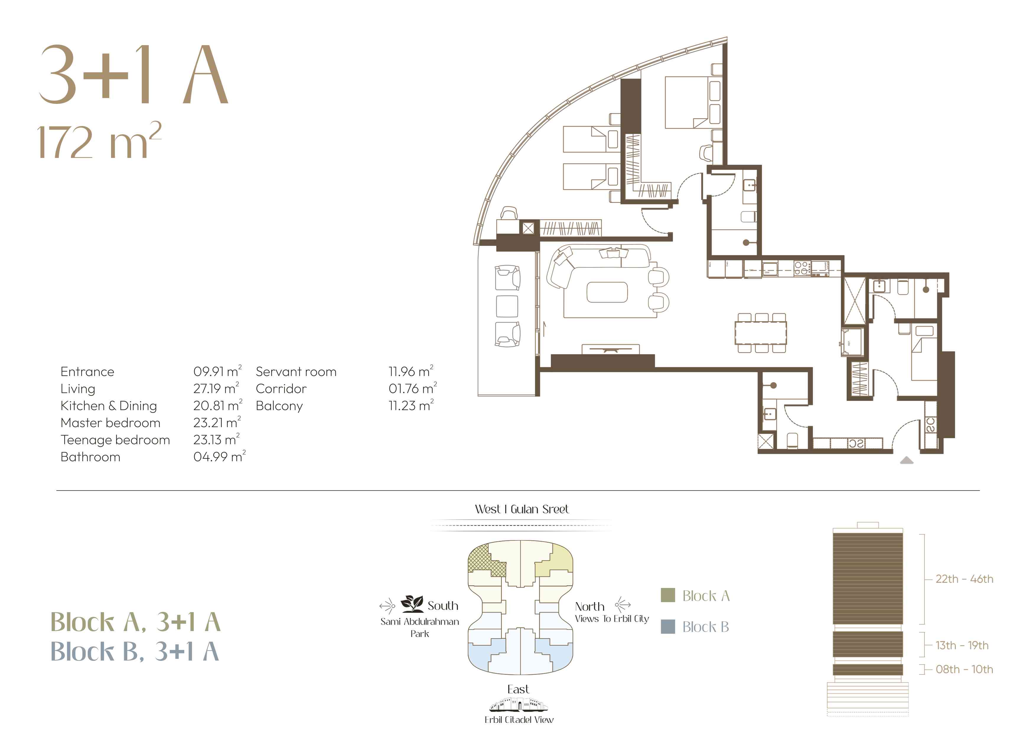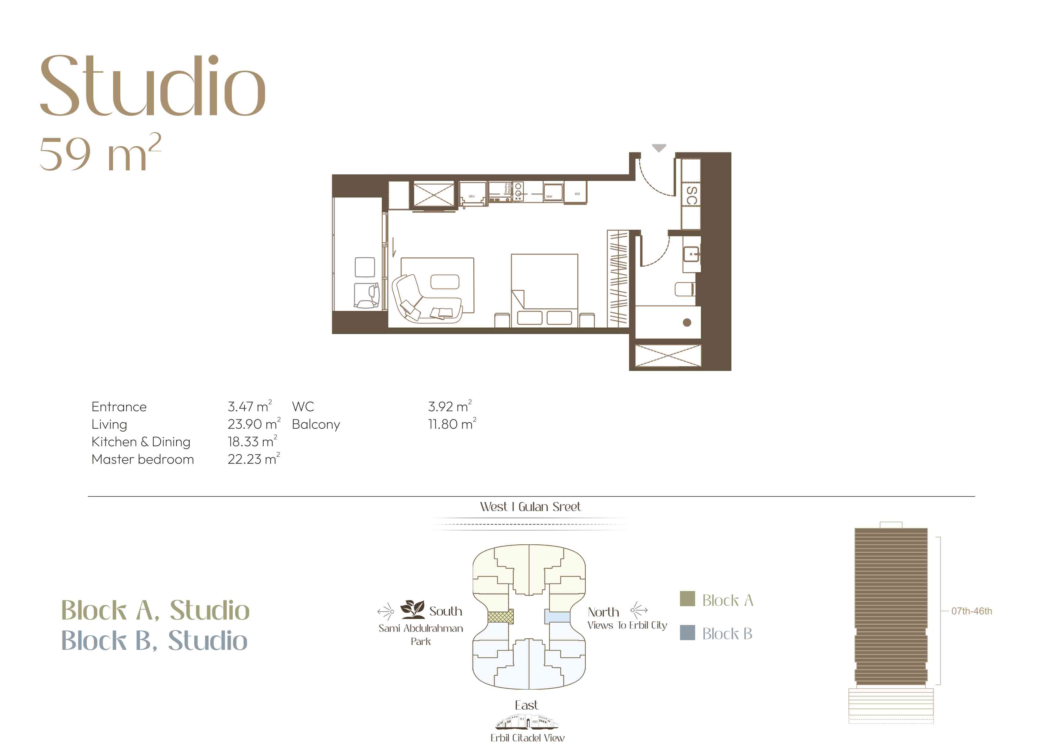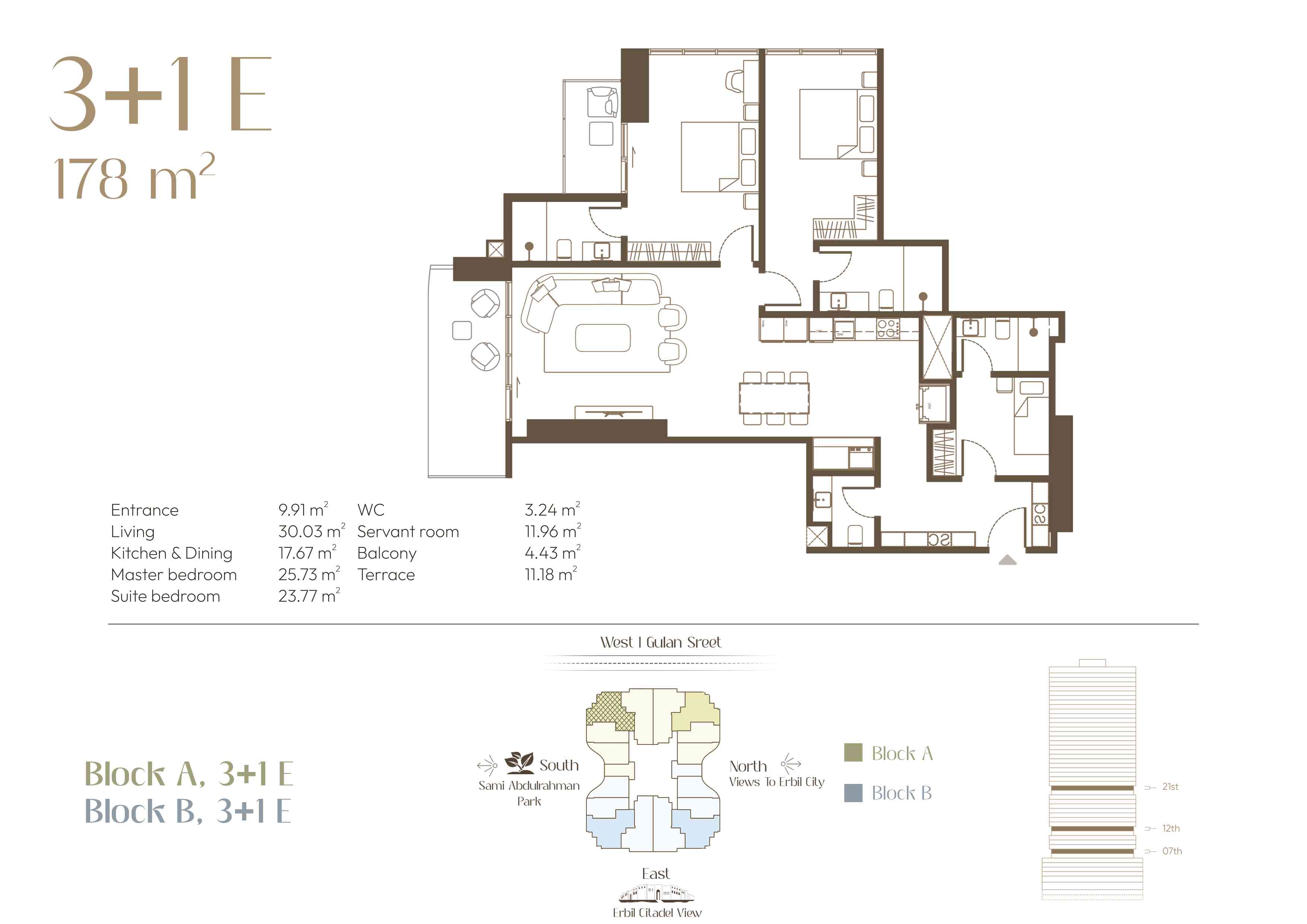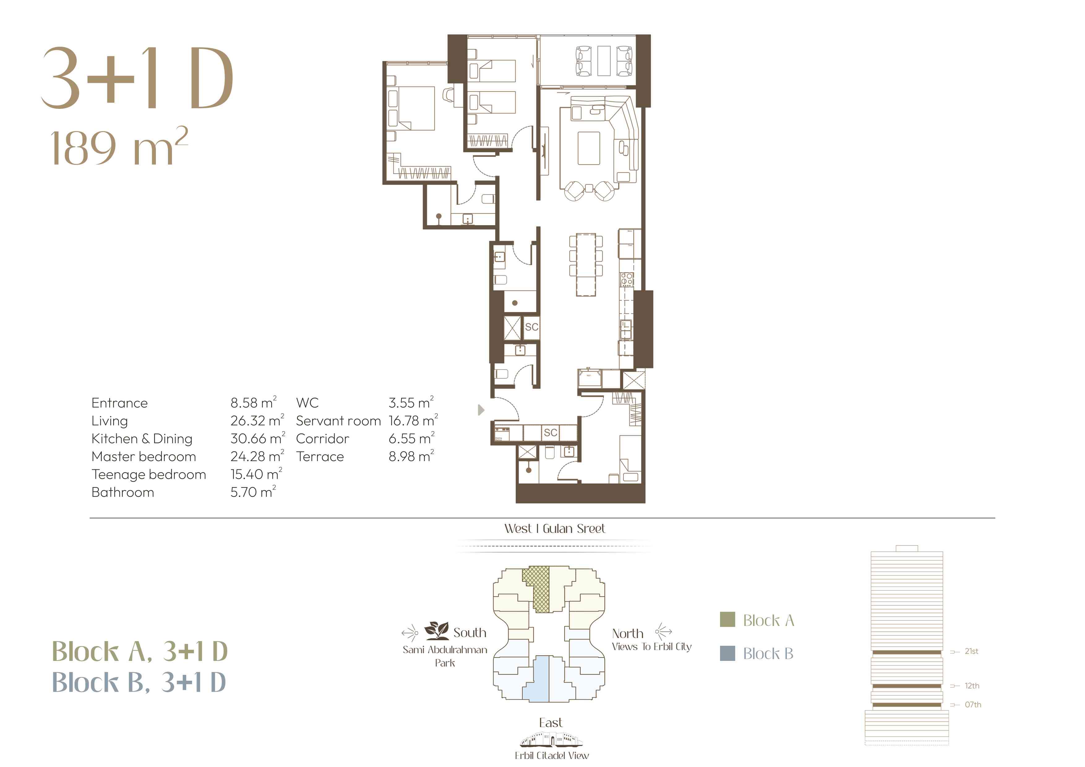 Located in the heart of Erbil City, along with Gulan street (40 metre St.), this residential complex represents modern luxury living. The design of each apartment is a balance of practicality and style, charming outdoor lighting, and unique views that redefine the idea of urban life. As the sun sets over the city and the decorative lights come on, enjoy the scenery from the comfort of your exclusive balcony.
